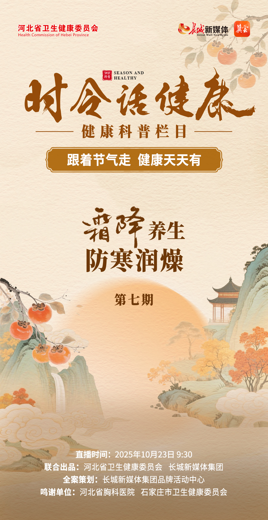 本期《时令话健康》,特邀河北省胸科医院呼吸内科大科主任李幸彬、中医科主任何萍,以及深耕体育教学30年的健康榜样陈志军老师,一起解读霜降健康要点。从呼吸道疾病防护、中医调理“护肺健脾”,到中老年科学运动细节、食疗润燥禁忌,专家们逐一拆解养生难题,更有实用互动答疑,助大家从容应对季节转换,稳度寒燥霜降天。