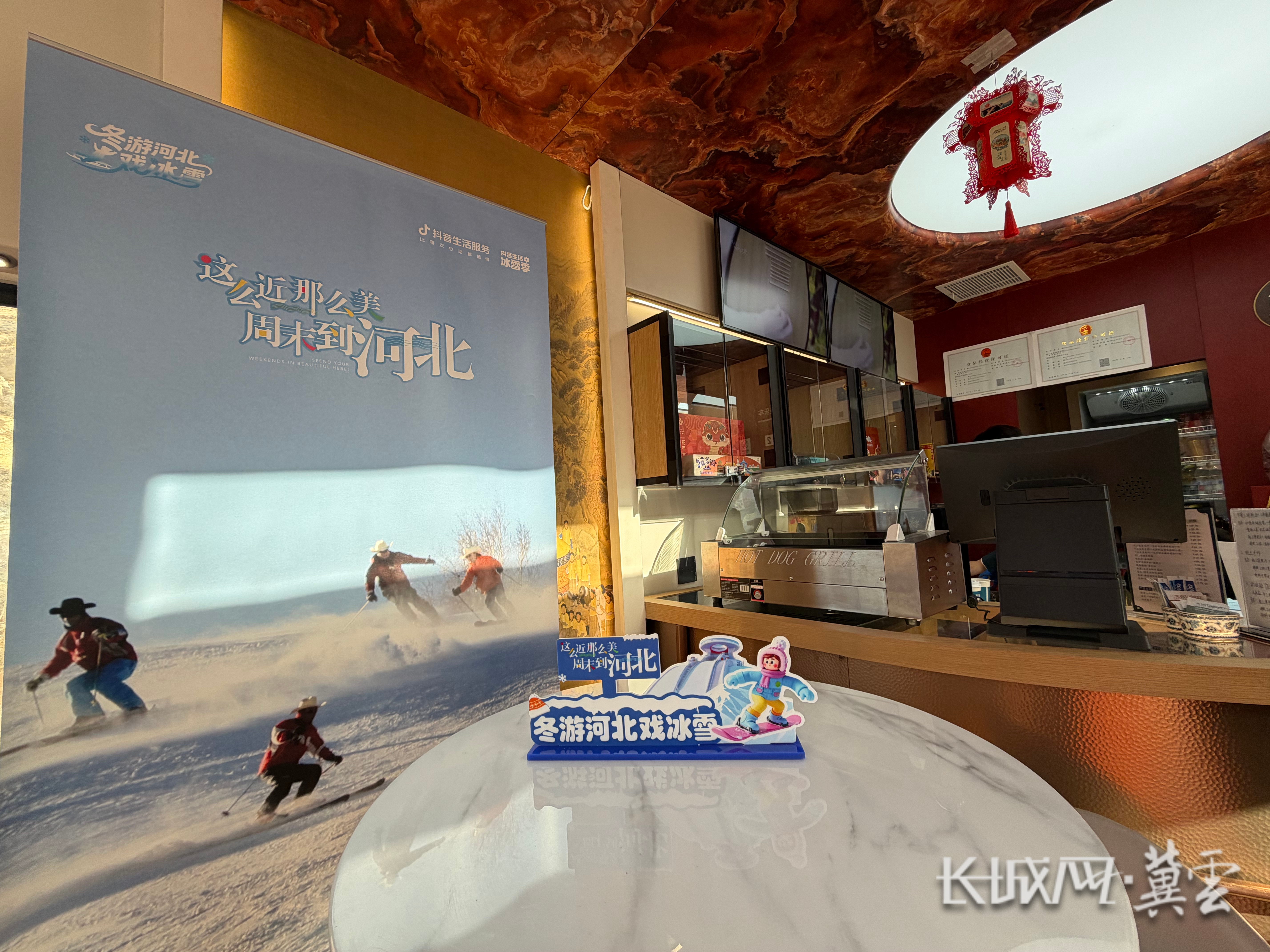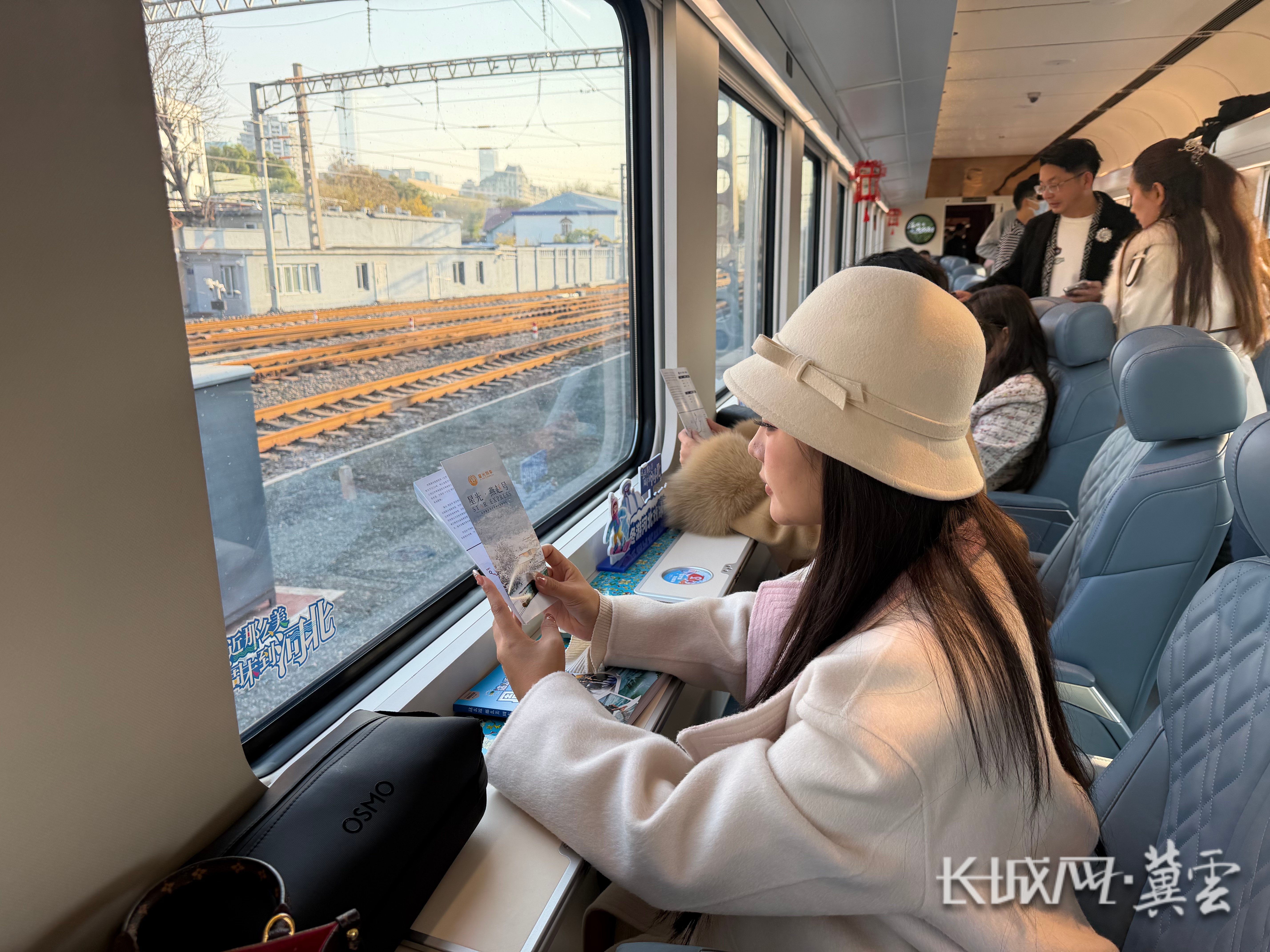 围绕“冬游河北戏冰雪”主题,列车构建了线上线下联动的氛围体系。线上在抖音平台以冰雪蓝、冰雪白为主色调进行主题推广;线下在车厢内通过车载大屏动态展示河北雪山、林海雪原及滑雪场场景,设置易拉宝介绍滑雪场设施与服务。车内还点缀传统宫灯元素,配备《一起研学“冀”》研学游线路手册、《这么近,那么美,周末到河北》精品路线图等宣传资料,供旅客随时取阅,全面营造冰雪主题沉浸氛围。