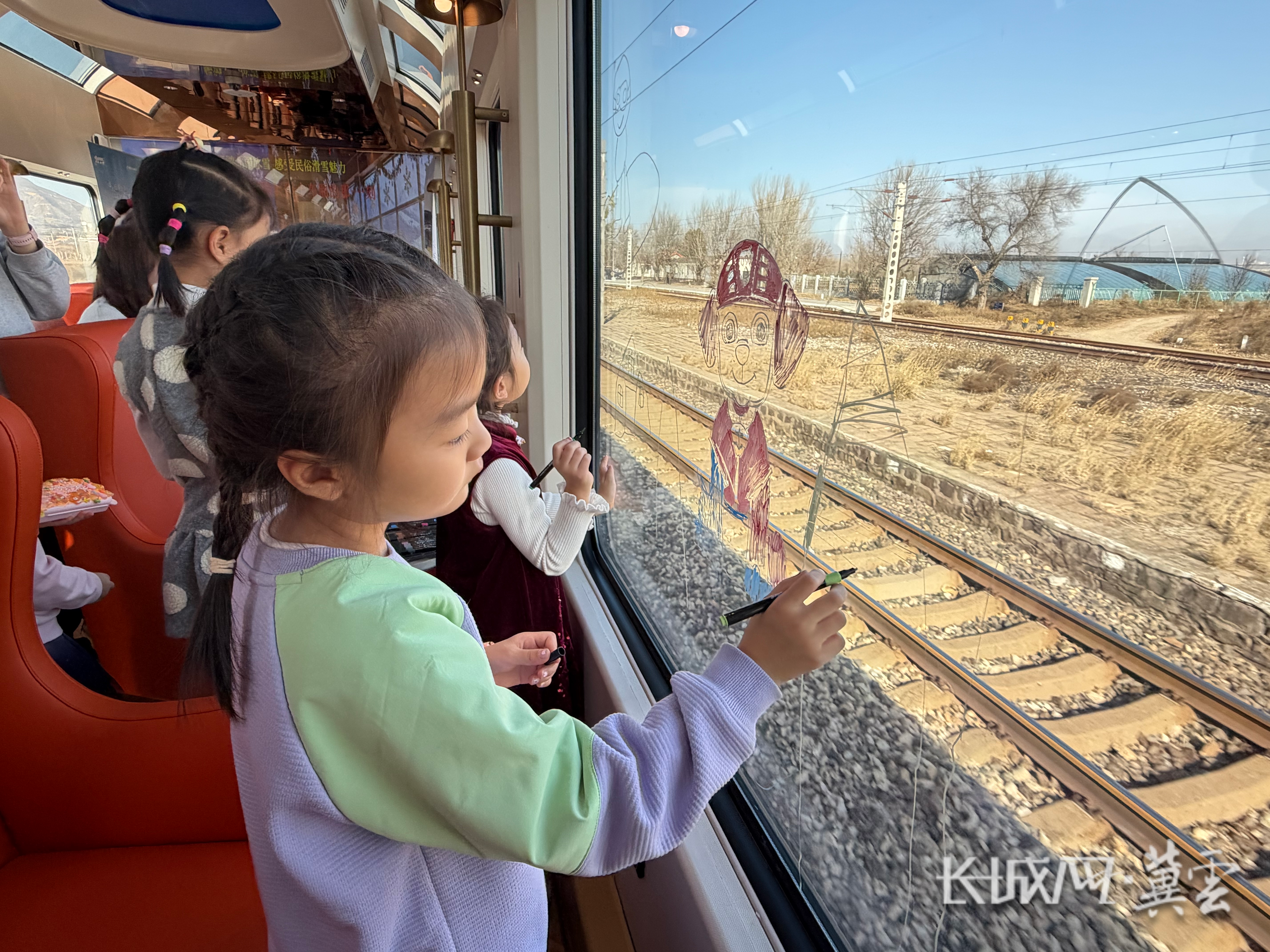 小游客在Y957次“星光·燕赵号”全景观光旅游列车的车窗上绘画。长城网·冀云客户端记者 王林红 摄
