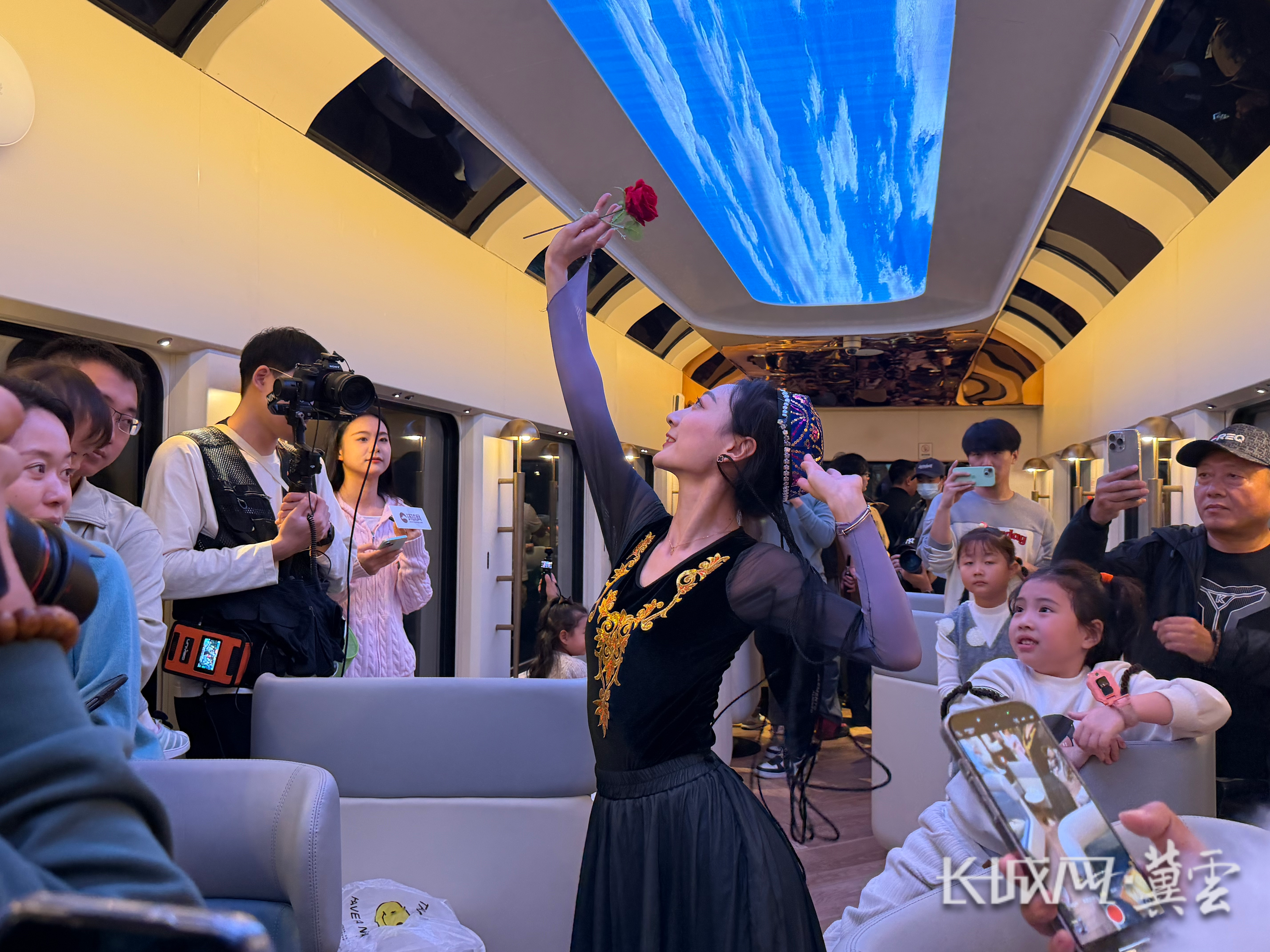 流动的舞台更添旅途乐趣。小丑演员穿梭在车厢间,与旅客互动打趣;民族舞蹈演员身着传统服饰翩翩起舞,舒展的舞姿展现着浓郁的民族风情;现代舞与快闪表演轮番登场,演员们活力四射的演绎让车厢氛围持续升温,游客们纷纷举起手机记录精彩瞬间,不少人还加入舞蹈队伍中即兴互动。车窗绘画、黏土手作等活动吸引了众多家庭参与,孩子们在家长的陪伴下尽情发挥想象力,创作出一个个充满童趣的作品。