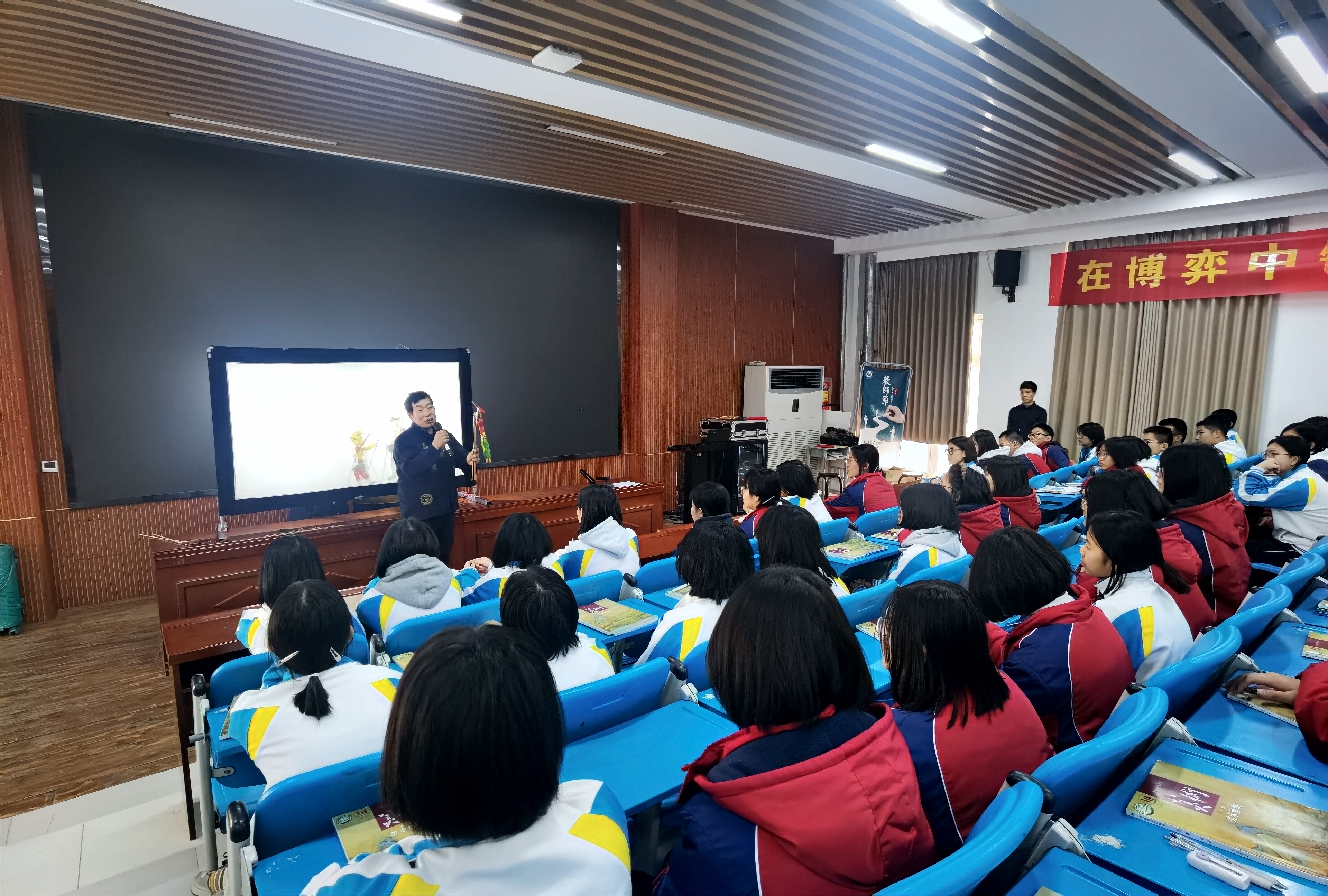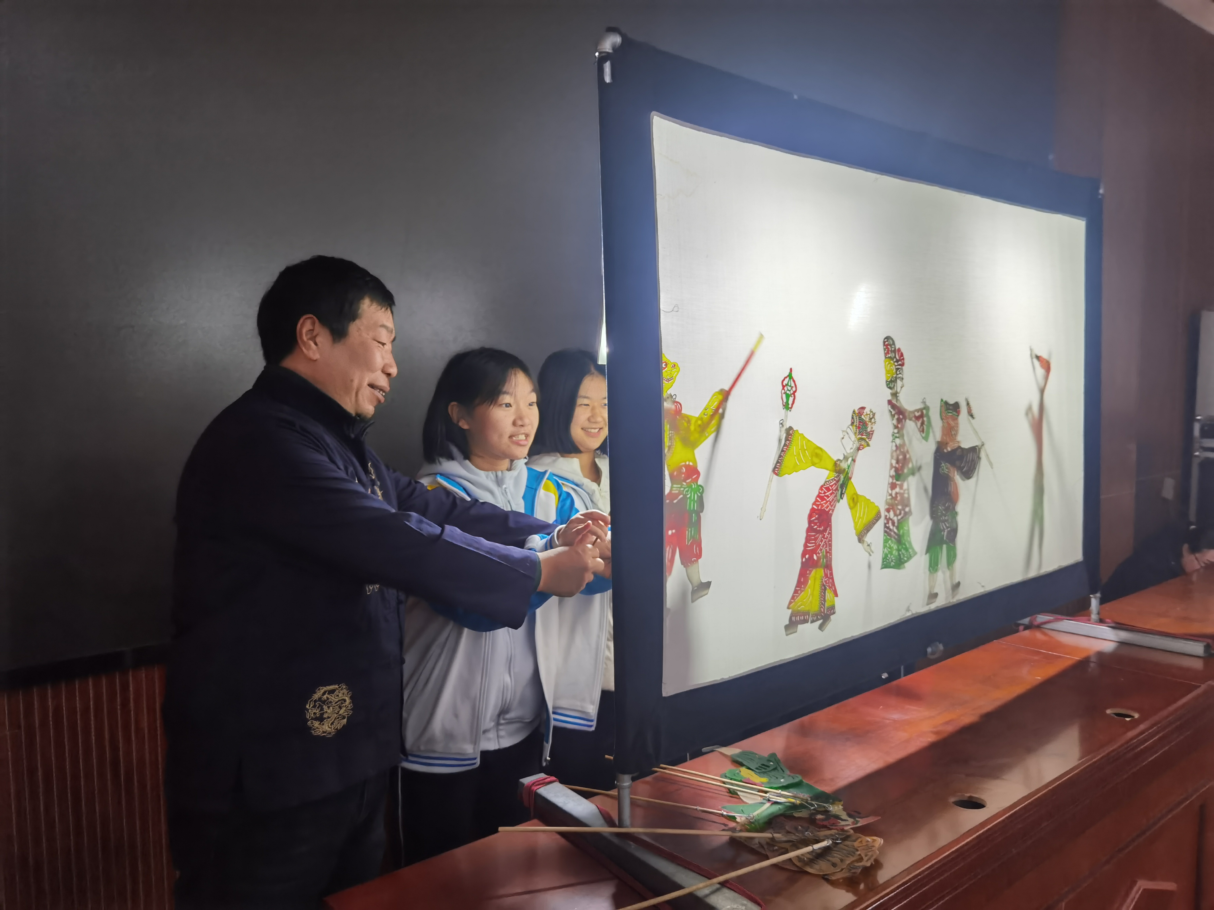 课堂上,朱春喜一边操纵影人,一边讲述皮影“前世今生”。学生们掌声、惊叹声此起彼伏,不少孩子更是第一次拿起影杆,完成属于自己的“皮影首秀”。他们纷纷表示,对非遗产生了浓厚兴趣,希望能够看到、学到更多非遗知识。