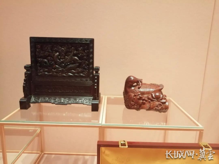 红木展区位于展厅大门北侧,这里无论是空灵雅致的大件,还是设计精巧的小件,都颇受参观者的喜爱。大件红木典雅贵气、小件红木实用且富有内涵。砚屏雕工更是栩栩如生,一件小小的荷塘情趣中,有戏鸭、有荷花、有水草,有浪起……