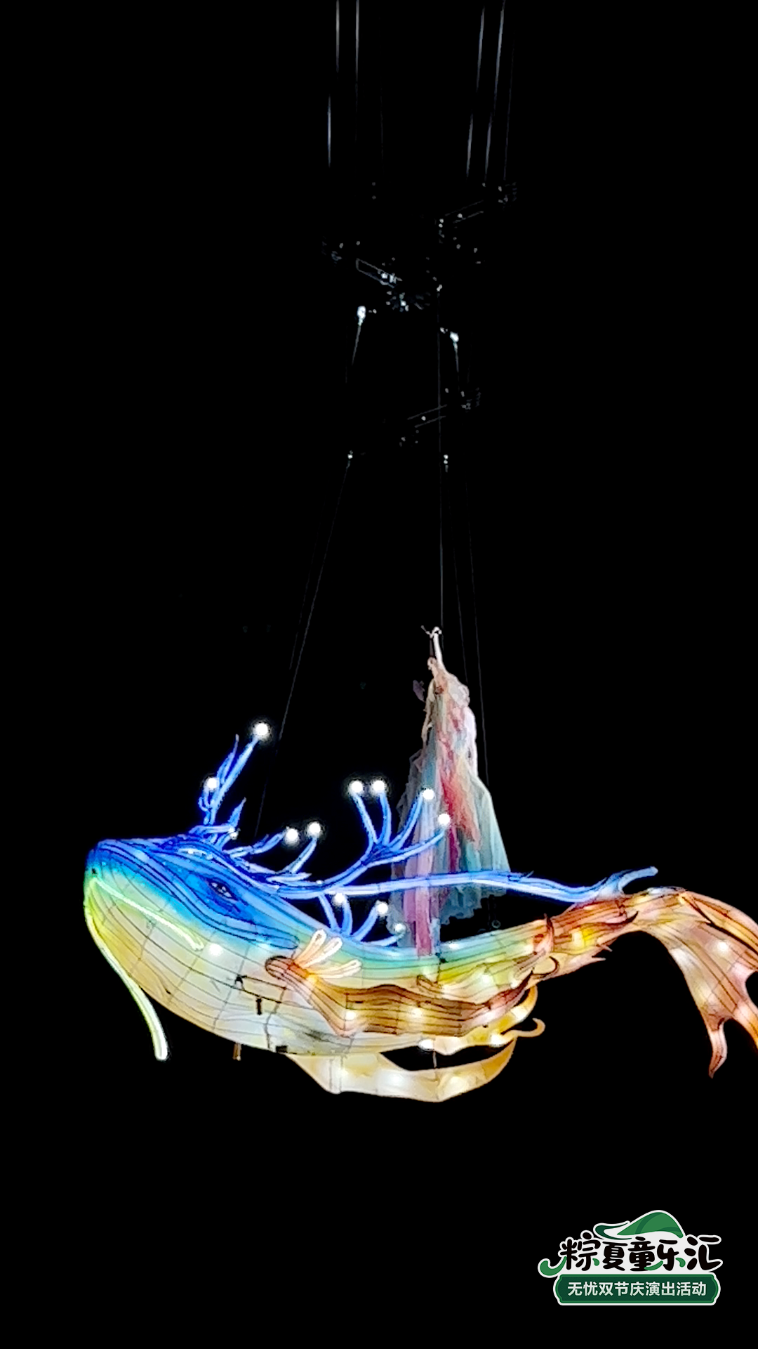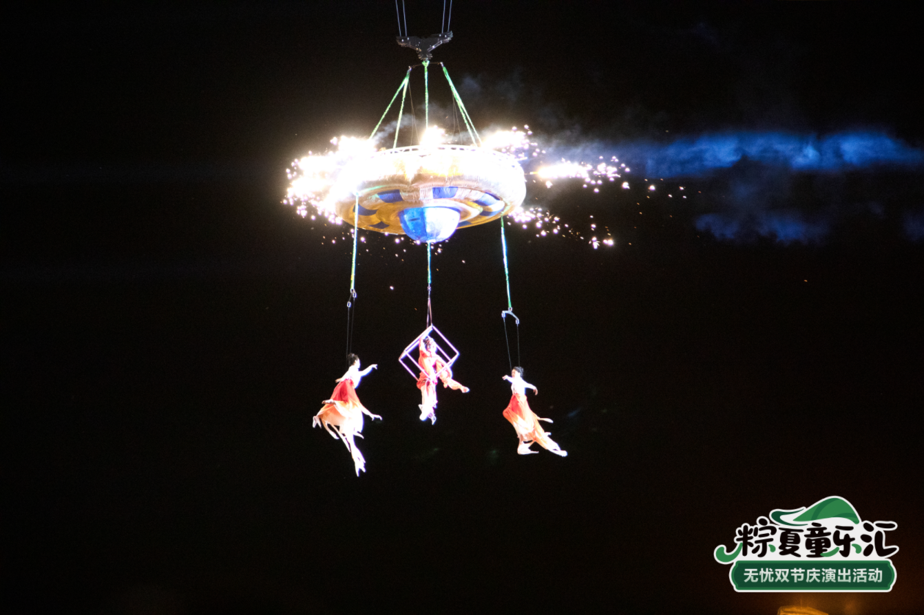 活动创新打造“五维沉浸”体验,实现非遗的破圈传播。独具匠心的“五色祈福”叙事,设置金木水火土五行主题互动站,由身着宋代古韵服饰的NPC引导游客参与“五彩绳吉祥传递”,将古老端午习俗转化为可触可感的沉浸剧情。科技赋能更为活动注入震撼视觉体验,威亚幻境《鲲鹏》借力光影重现庄子“水击三千里”的磅礴意境;威亚飞碟凌空旋舞,冷烟火随乐律绽放,化作流萤环绕,舞者于流光中完成高空翻转,尽显梦幻与力量的交融。小镇原创IP“无忧娃娃”化身活动向导,贯穿巡游、合影、剧场全环节,其衍生文创在市集热销,单品销售额环比激增200%,有力印证了文化IP的情感链接力与消费转化力。