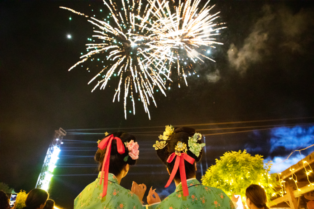 活动依托精心规划的“一主三副多点”演艺空间,日均数十场高品质演出无缝衔接,构建移步换景、无界畅游的体验。乐悠舞台化身童趣王国,国内首部动物主题互动巡游偶剧奇幻动物城与《挖呀挖》全场大合唱点燃亲子欢乐,儿童剧NPC触发隐藏任务增添探索趣味。清悠舞台尽显国风雅韵,鼓上舞与传统民乐珠联璧合,《云裳羽衣》再现盛唐风华,唐代复原妆造免费体验吸引游客深度融入。福悠舞台打造云端奇观,威亚《仙女撒花》衣袂翩跹、花瓣纷飞,飞碟光影秀融合冷烟火与科技感,带来视觉冲击。无忧主舞台则上演时空碰撞,《霍元甲》刚劲扇舞与《苏妲己》屏风舞激情跨界,引爆全场高潮;《童年》《沧海一声笑》引发三代人深情合唱,手机汇成的灯海点亮古镇夜空,相关短视频传播量突破50万次。
