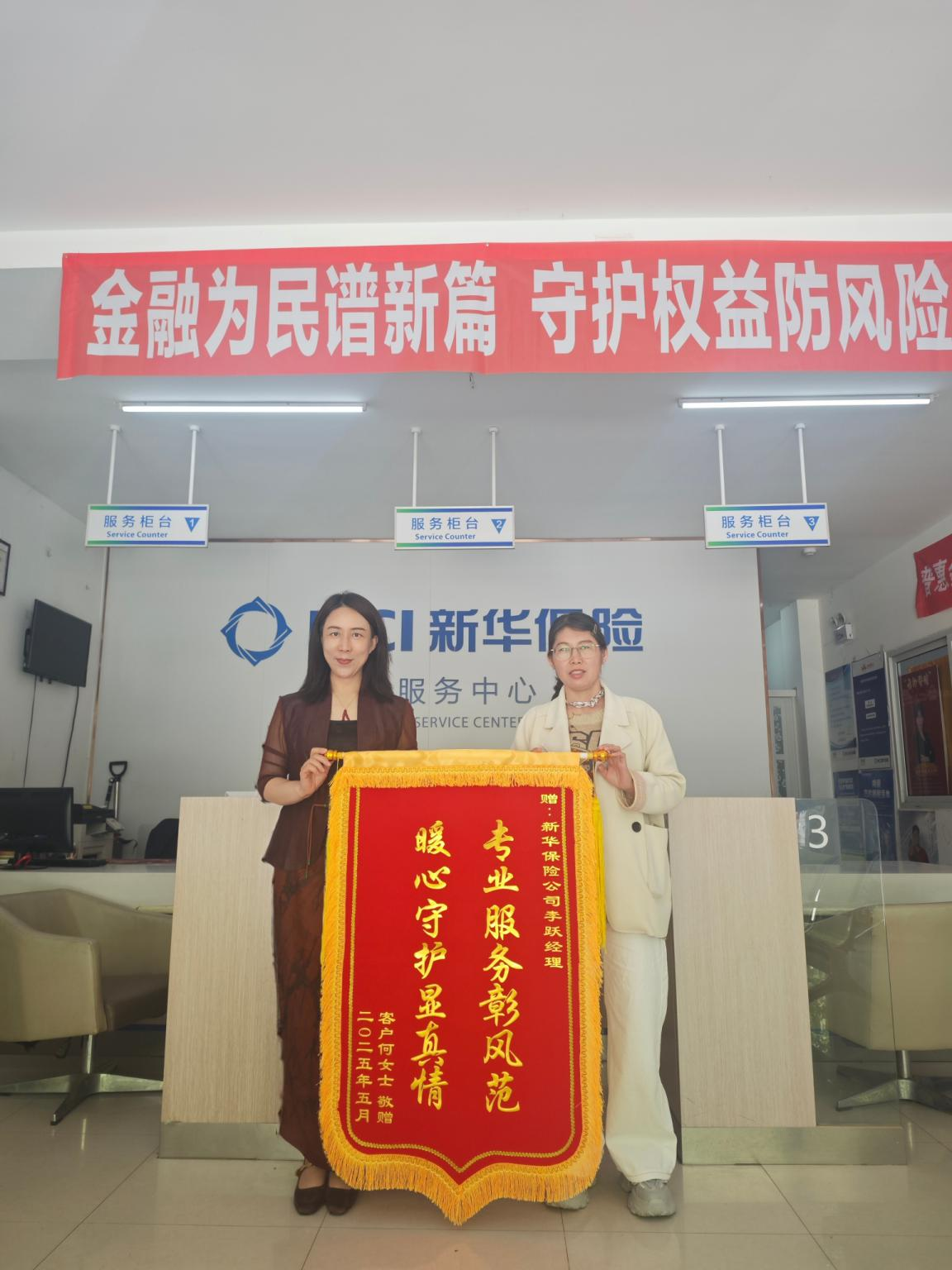何女士对新华保险全流程服务赞不绝口:“从联系住院到完成理赔,每个环节都感受到专业与温度,真正解决了我们的燃眉之急。”为表示谢意,她专程向秦皇岛中支赠送锦旗。鲜红锦旗上的烫金文字,成为客户对新华服务最直观的认可。