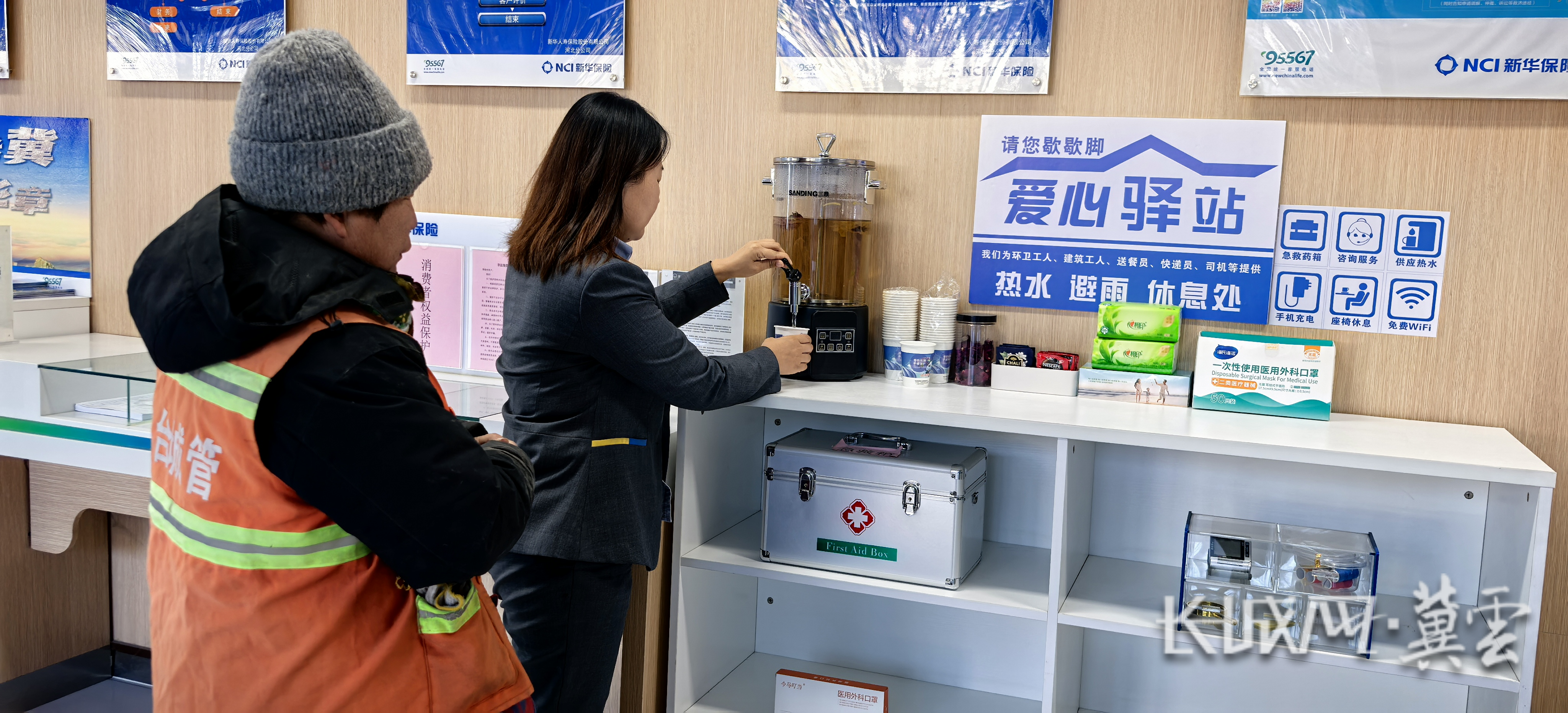 新华保险邯郸中支客服大厅专门设立了“爱心驿站”,志愿者特意精心熬制了梨汤,送到前来办理业务的客户以及周边的社会劳动者手中。穿梭于寒风中的快递员、辛勤维护城市环境的保洁人员、坚守岗位的保安……都可以在此驻足片刻,免费领取热气腾腾的梨汤,不但润肺止渴,还能抵御寒冷侵袭。小小的驿站,成为寒冬里一个温暖的港湾,传递着新华保险邯郸中支对社会一线劳动者的尊重与关爱,彰显了企业的社会责任与担当。
