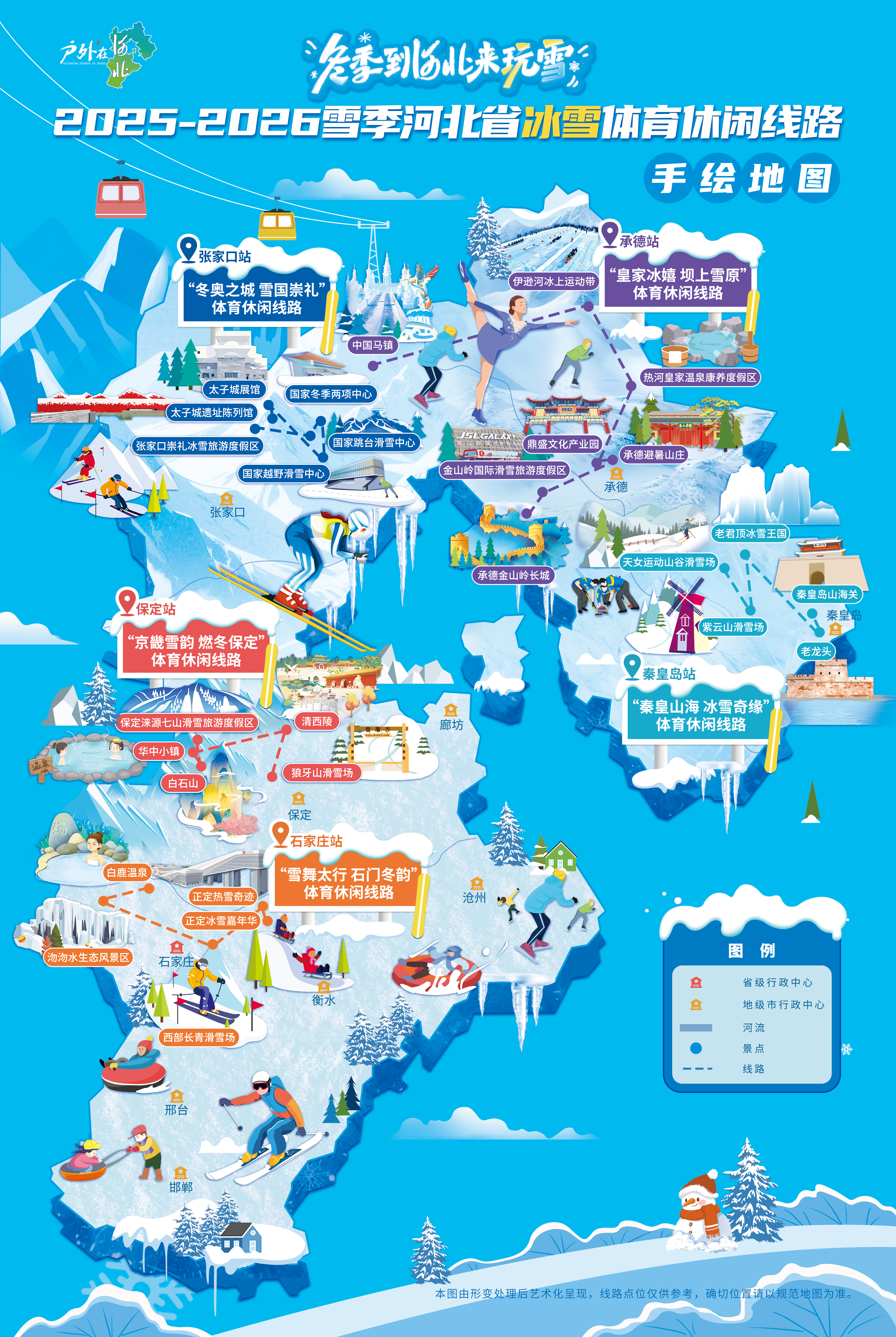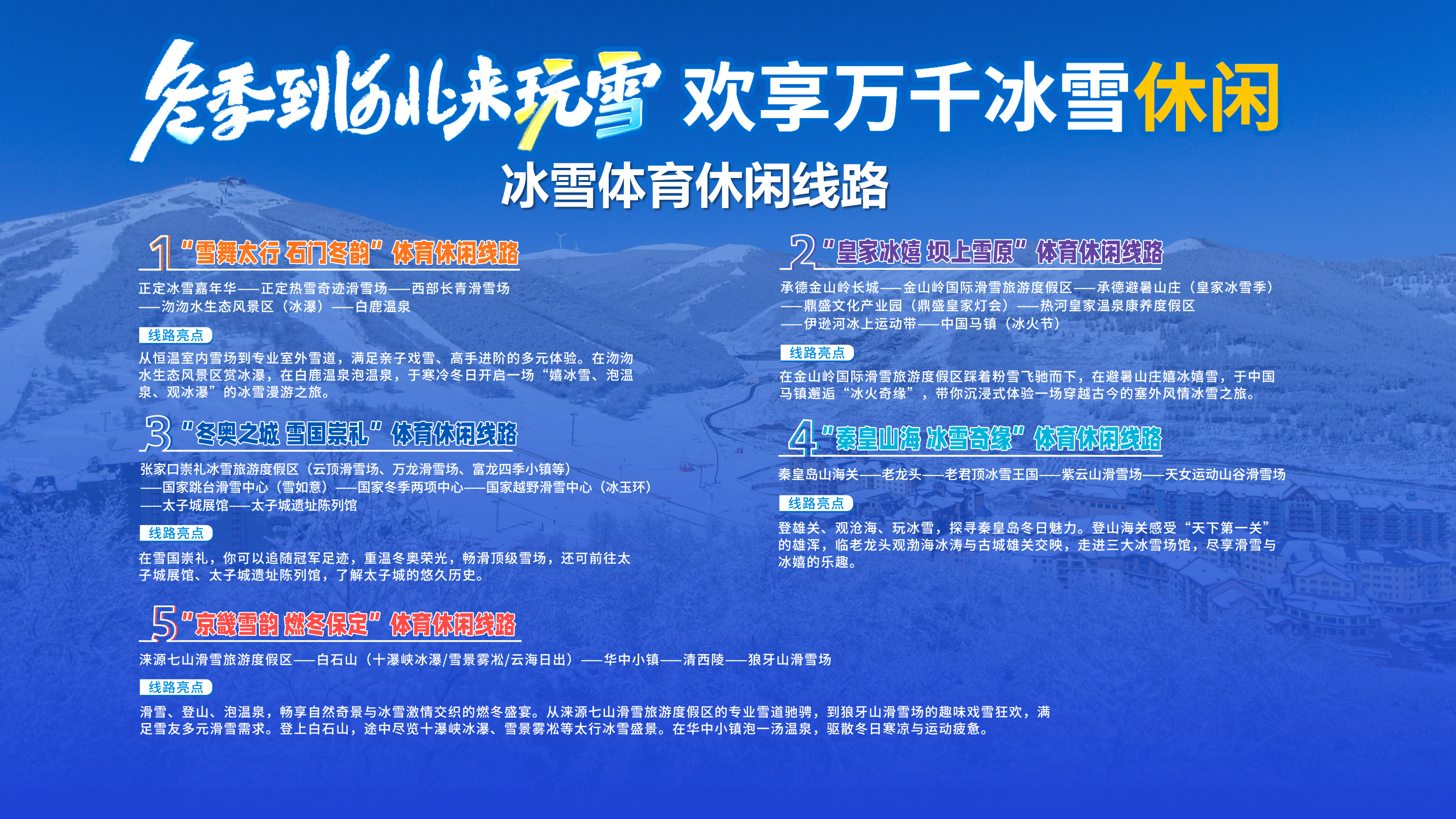 其中,石家庄市举行研学冬令营、“冰雪过大年”亲子运动会等冰雪休闲活动;承德市举行2025—2026“皇家冰雪 龙腾热河”户外运动季、承德冰嬉大典、“山滦骑遇·踏雪寻冬”系列雪骑活动、木兰围场冬捕冰钓等冰雪休闲活动;张家口市举行大众冰雪研学季、雪上定向狂欢节、康巴诺尔冰雪嘉年华,以及雪地电音节、冰雪主题微短剧等冰雪休闲活动;秦皇岛市举行“秦皇岛之冬·欢乐冰雪季”冰雪嘉年华系列活动,涵盖万人雪地拔河、万人滑雪和紫云山夜滑体验等冰雪休闲活动;保定市举行中国·保定(涞源)冰雪户外运动大会、“浪漫冰雪 爱在保定”冰雪运动嘉年华系列活动,各区县同步推出冰雪运动会、滑雪比赛及戏雪活动等冰雪休闲活动。“雪舞太行 石门冬韵”“皇家冰嬉 坝上雪原”“冬奥之城 雪国崇礼”“秦皇山海 冰雪奇缘”“京畿雪韵 燃冬保定”等5条冰雪体育休闲线路各具特色,带领广大冰雪运动爱好者尽享“冰雪+温泉”“冰雪+演艺”“冰雪+民俗”“冰雪+美食”的冬日狂欢。