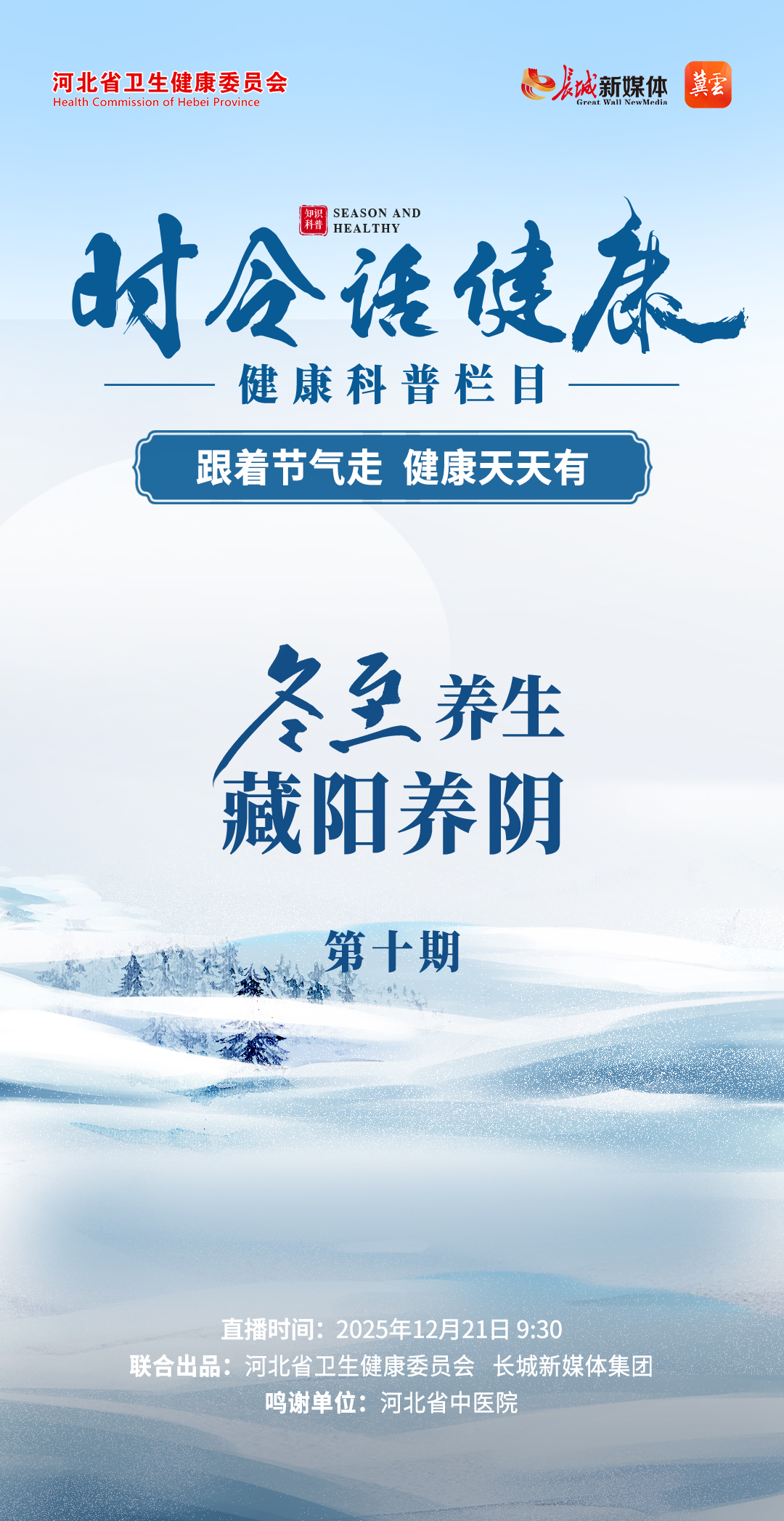 本期《时令话健康》特邀国医大师、河北省中医院名誉院长李佃贵,河北省中医药文化科普巡讲专家、省中医院治未病中心首席指导专家何红涛,以及健康榜样、河北健促会传统导引养生专业委员会负责人胡增平,从中医理论与日常养生双路径出发,深入解读冬至时节的养生妙法,助力大家暖养过冬。