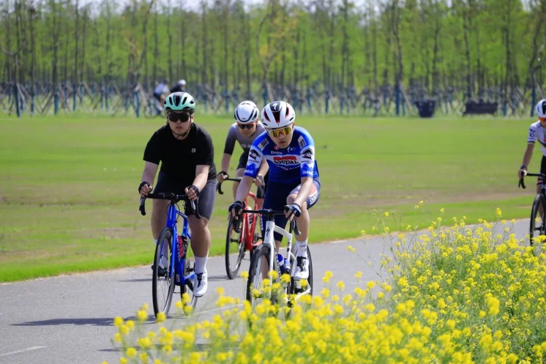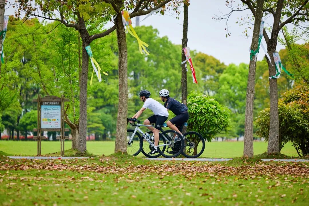 清晨8点,随着发令笛响,骑手们从新城公园出发,沿南门景观大堤、北沿公路、北湖等特色路段前行,穿梭于田园、林地与水系交织的画卷,将江景、湿地、林荫尽收眼底。